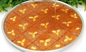6. فور خروجها من الفرن، يُسكب الشربات الدافئ عليها ويترك حتى تمتصه تماماً.