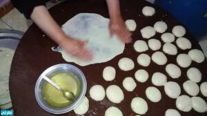 – بعد أن ترتاح العجينة، تُقسم إلى كرات صغيرة.
