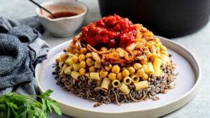 يتميز الكشري المصري بمزيج لذيذ ومتناغم يحتوي على الأرز، المكرونة، العدس، الصلصة، والبصل المقرمش.